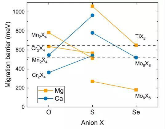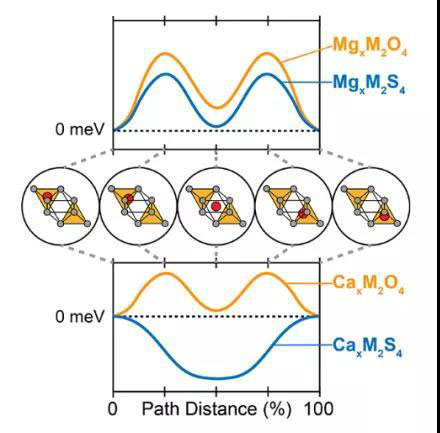 圖28 在氧化物(橙色)和硫化物(藍(lán)色)尖晶石中觀察到的Mg(頂部)和Ca(底部)遷移勢(shì)壘的定性表征