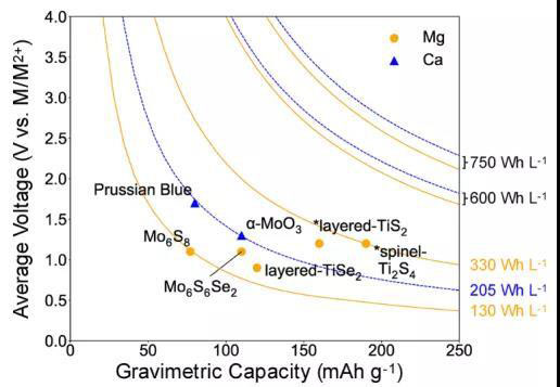鎂電解液的改進(jìn)急需開發(fā)更高電壓的陰極。圖26中顯示了多價(jià)離子陰極的比容量與電池能量密度曲線。