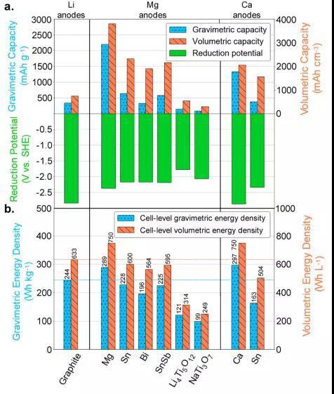 圖25 (a)Mg和Ca陽(yáng)極的理論重量/體積容量和還原電位。(b)估算的電池級(jí)重量/體積能量密度