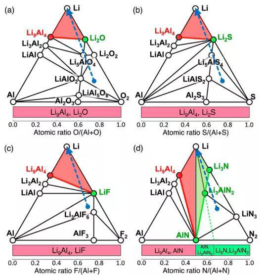 圖20 (a) Li?Al?O, (b) Li?Al?S, (c) Li?Al?F, (d) Li?Al?N體系的相圖