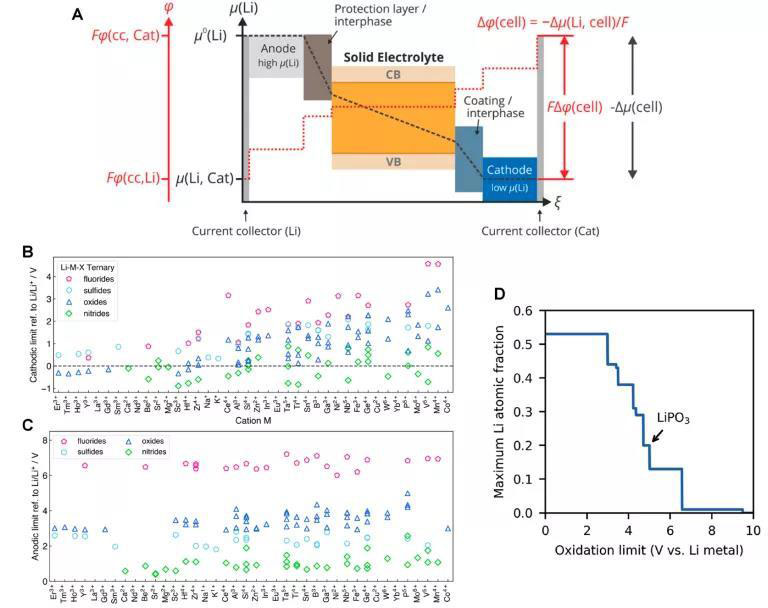 圖19 (a) ASSB電池的勢(shì)能曲線。(b,c)Li?M?X三元化合物的氧化/還原極限(M=陽(yáng)離子,X=N,O,S,F)。(d) 聚陰離子氧化物的最大Li原子分?jǐn)?shù)與氧化極限的關(guān)系