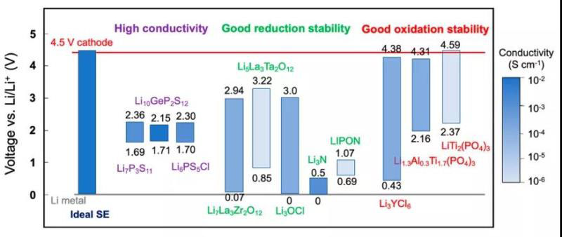 SEs的穩(wěn)定性對(duì)于評(píng)估ASSB的長(zhǎng)循環(huán)壽命至關(guān)重要。圖18顯示了不同電解質(zhì)的氧化和還原極限。顯然,SE的穩(wěn)定性在很大程度上取決于材料的化學(xué)性質(zhì)。目前還沒(méi)有兼具高氧化極限和低還原極限的SE。