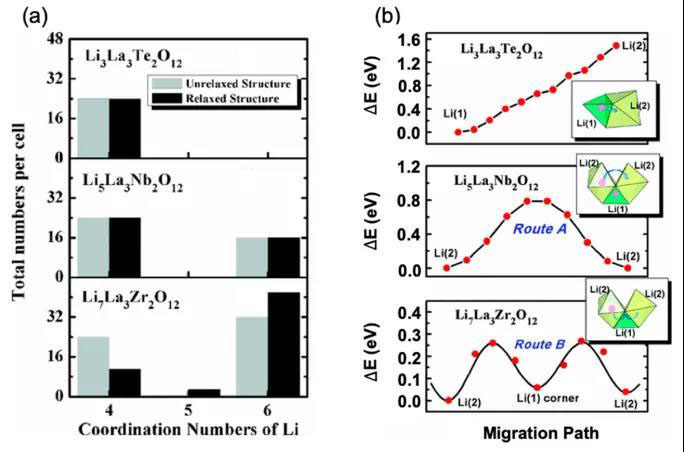 圖16 LixLa3M2O12(M=Te,Nb,Zr)中(a) Li+的配位數(shù),(b)Li+遷移能壘圖
