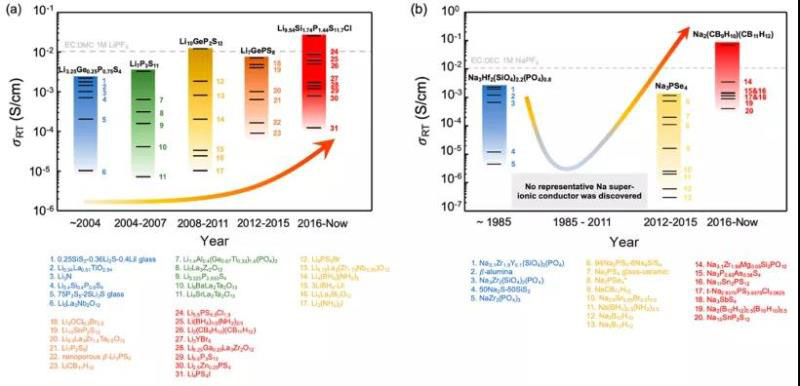 圖14 (a)快Li+和(b)快Na+導(dǎo)體的進(jìn)展