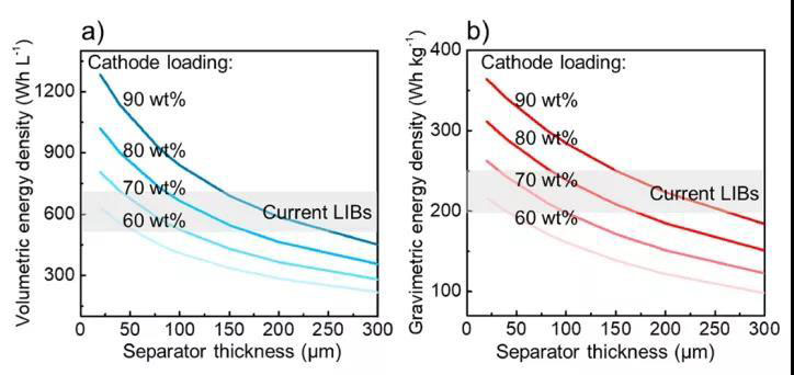 圖13 估算的ASSB電池級(jí)(a)體積和(b)重量能量密度