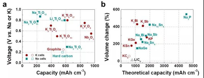圖12a總結(jié)了平均電壓低于1 V(vs Na/Na+或K/K+)的嵌入型陽(yáng)極材料的容量。僅少數(shù)化合物(Li4Ti5O12,Na2Ti3O7,K2Ti8O12,K2V3O8和Nb2O5)的容量比石墨(K)和硬碳(Na)更高,但較高的嵌入電壓最終降低了電池的能量密度。