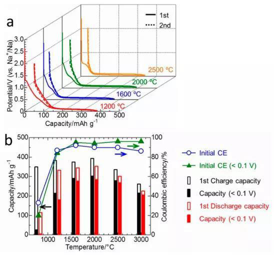Na不能嵌入石墨,因此硬碳被用作NIB的陽(yáng)極。其容量和電壓曲線均受合成條件(溫度)的影響,如圖11所示。