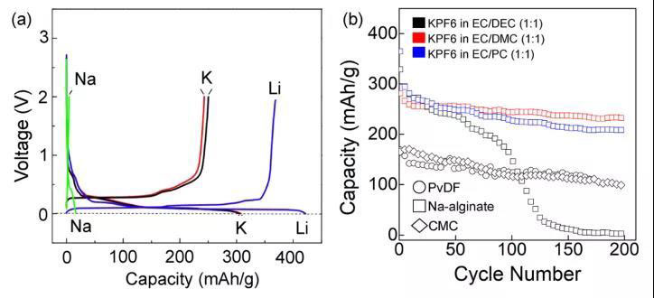 圖10 (a)采用聚丙烯酸酯粘結(jié)劑的石墨電極的充放電曲線。(b) KIB中粘結(jié)劑和電解質(zhì)對(duì)石墨陽(yáng)極容量的影響