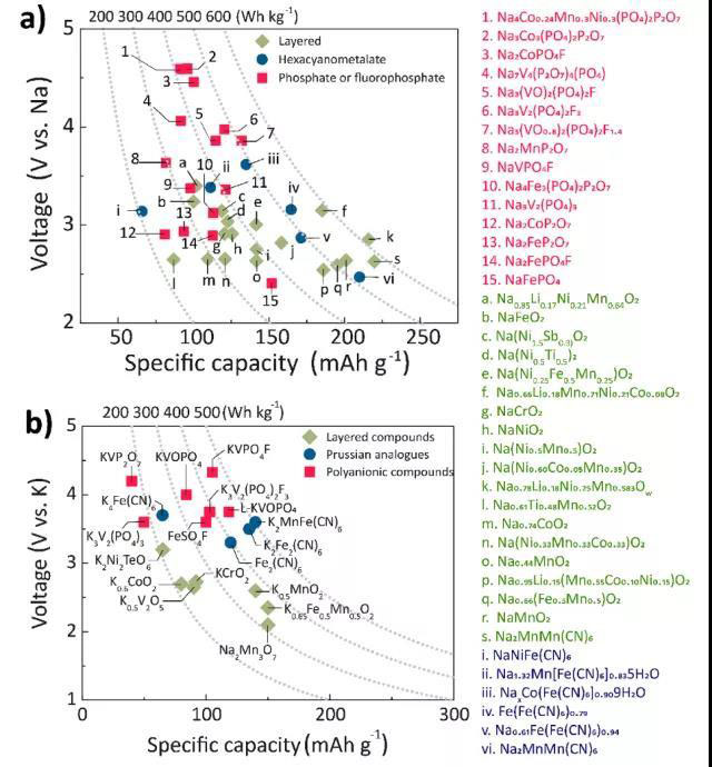 總之,聚陰離子化合物在NIB和KIB中具有巨大的應(yīng)用潛力。實(shí)驗(yàn)研究了過(guò)渡金屬和陰離子基團(tuán)的不同組合,以確定其Na+/K+的嵌入電壓和容量,如圖9所示。