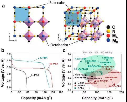 PBA是一類具有六方鈣鈦礦型,面心立方結(jié)構(gòu)(空間群Fm3?m)的金屬鐵氰化物,如圖8a所示,其化學(xué)組成為AxMA[MB(CN)6]y(A=Li,Na,K等,M=過(guò)渡金屬(Fe,Mn,Co,Ni,Cu等),0<x<2))。圖8b為AxMn[Fe(CN)6](A=Li, Na, K)的放電曲線。隨插層離子尺寸的增大,電壓也隨之增大。圖8c所示 PBA中K+嵌入的高電壓可能是由于K+與金屬有機(jī)骨架之間的相互作用更強(qiáng),穩(wěn)定了放電產(chǎn)物。