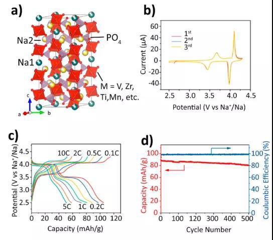 圖7 a)典型的NASICON型晶體結(jié)構(gòu)。Na3MnZr(PO4)3 的(b)循環(huán)伏安曲線,(c)倍率性能,(d)循環(huán)性能