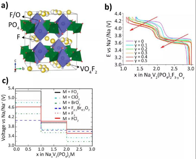圖6 (a) NaxM2(PO4)2F3-yOy的晶體結(jié)構(gòu)。 (b) NaxM2(PO4)2F3-yOy (0≤y≤0.5)在C/20下循環(huán)時(shí)的電壓曲線。(c)從理論計(jì)算分析Na3V2(PO4)2F3的改性