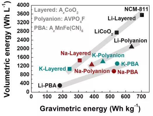 圖5比較了層狀氧化物(如AxCoO2)、聚陰離子化合物(如AVPO4F)和PBAs(如A-MnFe (CN)6)(A=Li,Na,K)的重量和體積能量密度,可見堿離子尺寸的不同影響導(dǎo)致在Na/K體系中,聚陰離子化合物/PBA的體積能密度與層狀化合物相當(dāng),具有與層狀氧化物競(jìng)爭(zhēng)的潛力。