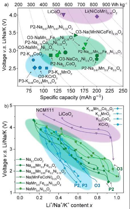 圖4 (a)Na層狀氧化物(綠色)、K層狀氧化物(藍(lán)色)、Li層狀氧化物(紫色)的電壓與容量曲線。(b)不同堿金屬層氧化物的放電曲線