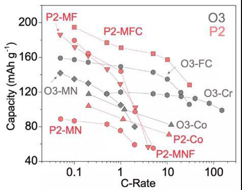 分子式為NaxMO2(KxMO2),通過(guò)共邊的MO6八面體形成重復(fù)的層結(jié)構(gòu),Na+/K+位于層間。通過(guò)堿離子周圍的配位幾何結(jié)構(gòu)(O,八面體;P,棱形)及最少重復(fù)單元(O-M-O和O-堿金屬-O)的堆垛層數(shù)來(lái)標(biāo)記。如P2表示具有棱形配位和ABBA型氧堆積。O3表示具有八面體配位和ABCABC氧堆積。圖3總結(jié)了各種P2-Na和O3-Na層狀氧化物陰極的倍率性能。在比較不同材料的倍率能力時(shí),需考慮電池組裝,電極制備,粒徑和形態(tài)以及導(dǎo)電添加劑的影響。