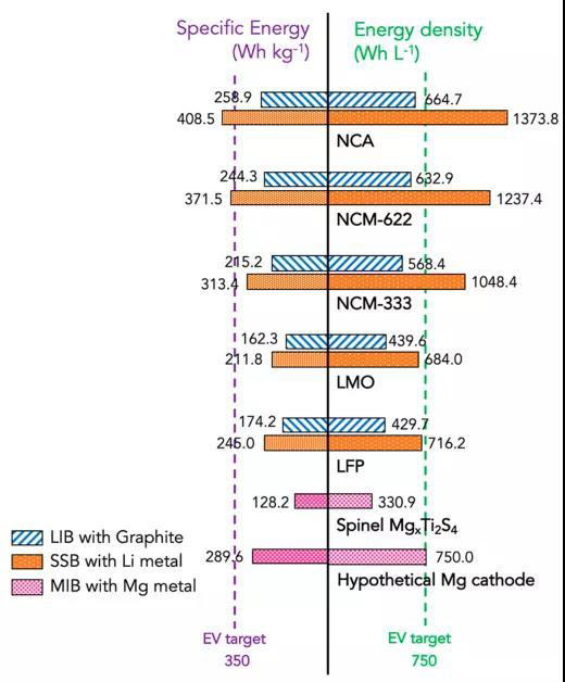 固體電池(ASSBs)采用固態(tài)離子導(dǎo)體作為電解質(zhì)(SE)來(lái)替代可燃有機(jī)液體電解質(zhì),可緩減著火或爆炸等安全問(wèn)題,同時(shí)ASSBs中鋰金屬陽(yáng)極的潛在使用被認(rèn)為可獲得比LIBs更高的能量密度。圖13顯示了基于NMC622陰極,Li3PS4(LPS)SE和Li金屬的ASSB預(yù)估的體積和重量能量密度。