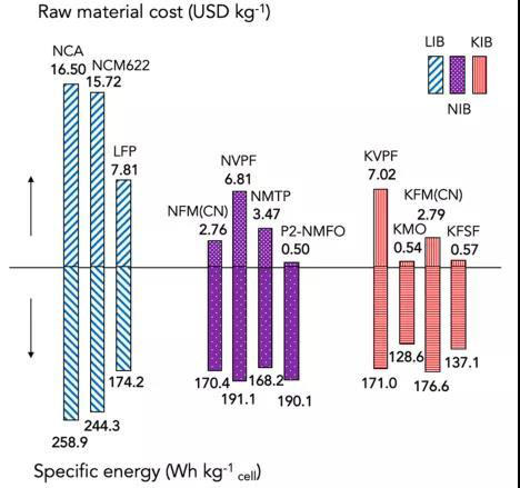 NIB/KIB是“下一代電池”技術(shù)的代表性示例,二者有望解決LIB所面臨的資源問(wèn)題,在NIB或KIB的陰極材料中使用價(jià)廉的氧化還原物質(zhì)(如Mn和Fe)替代Co和 Ni有望降低電池的總成本,使其在對(duì)重量和體積能量密度要求不太高的領(lǐng)域作為具有成本優(yōu)勢(shì)的替代方案。圖1比較了LIBs、NIBs和KIBs陰極材料的原材料成本以及使用這些材料構(gòu)建的全電池的質(zhì)量能量密度。