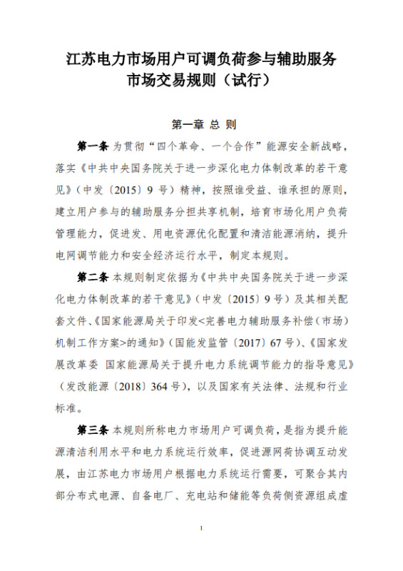 關(guān)于印發(fā)《江蘇電力市場(chǎng)用戶可調(diào)負(fù)荷參與輔助服務(wù)市場(chǎng)交易規(guī)則(試行)》的通知