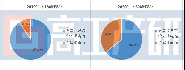 1)2020年金屬板電堆出貨功率占比提升26.8%,2020年金屬板電堆出貨功率提升幅度較大主要因為捷氫科技、上海氫晨、新研氫能等企業(yè)的金屬板電堆實現(xiàn)批量交付。