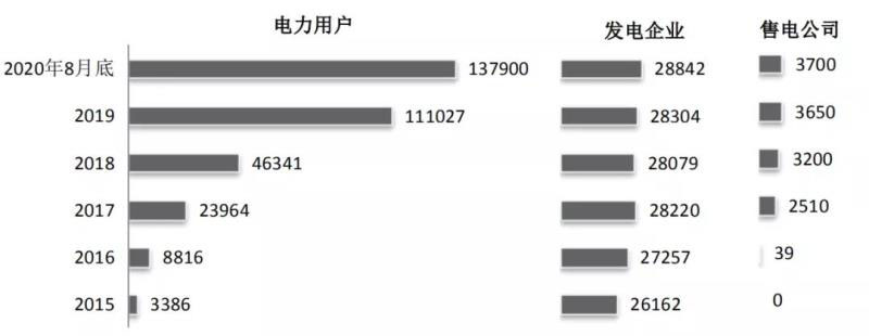 市場(chǎng)主體方面。截至2020年8月底,國(guó)家電網(wǎng)公司經(jīng)營(yíng)區(qū)域內(nèi)各電力交易中心共注冊(cè)市場(chǎng)主體約17萬家,較2019年底增加約2.7萬家,是2015年底的6倍。其中,發(fā)電企業(yè)28842家(裝機(jī)容量14.6億千瓦),較2019年底增加538家;售電公司3700家、電力用戶13.79萬家,較2019年底分別增加50家、2.69萬家。