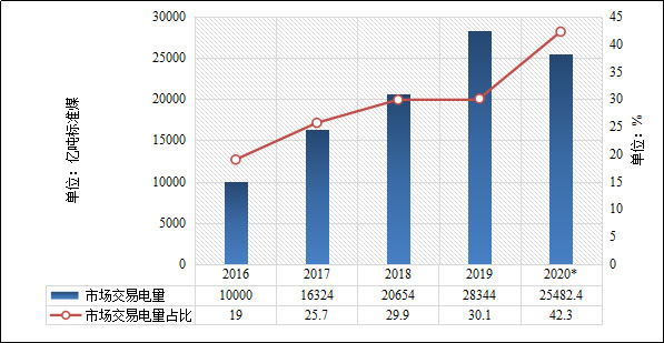 經(jīng)過持續(xù)努力,我國(guó)已初步形成在空間范圍上覆蓋區(qū)域、省級(jí),在時(shí)間周期上覆蓋年度、月度、月內(nèi)的中長(zhǎng)期交易及日前、日內(nèi)實(shí)時(shí)電力現(xiàn)貨交易,在交易標(biāo)的上覆蓋電能量、輔助服務(wù)、可再生能源消納權(quán)重等交易品種的市場(chǎng)體系結(jié)構(gòu)。2020年,我國(guó)電力市場(chǎng)參與主體不斷增多,電力市場(chǎng)化交易規(guī)模及占比持續(xù)擴(kuò)大,交易機(jī)構(gòu)股份制改造取得積極進(jìn)展,市場(chǎng)開放度顯著提升,市場(chǎng)活力進(jìn)一步釋放。