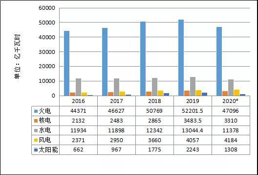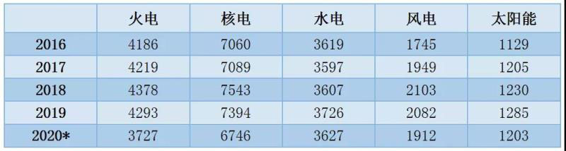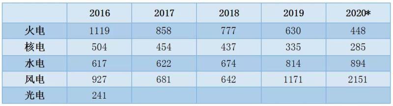 1~11月份,全國(guó)基建新增發(fā)電生產(chǎn)能力10203萬千瓦,比上年同期多投產(chǎn)2597萬千瓦。其中,水電1079萬千瓦、火電3934萬千瓦(其中燃煤2724萬千瓦、燃?xì)?20萬千瓦)、核電112萬千瓦、風(fēng)電2462萬千瓦、太陽能發(fā)電2590萬千瓦。水電、火電、風(fēng)電和太陽能發(fā)電比上年同期多投產(chǎn)740、517、816和795萬千瓦,核電比上年同期少投產(chǎn)297萬千瓦。預(yù)計(jì)2020年,全國(guó)基建新增發(fā)電裝機(jī)容量1.4億千瓦左右,其中非化石能源發(fā)電裝機(jī)投產(chǎn)9300萬千瓦左右。