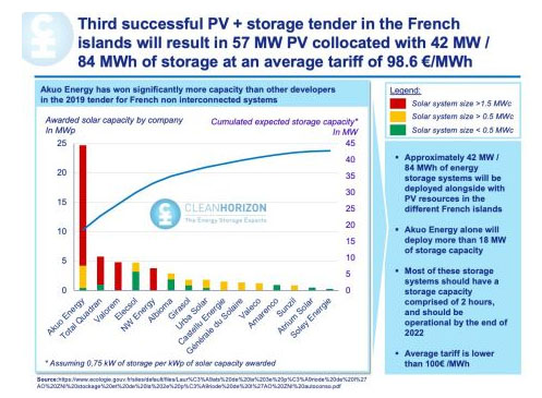 法國2020年度招標的結(jié)果已經(jīng)公布,這些招標項目將在法國的一些海外島嶼部署可再生能源發(fā)電設(shè)施和儲能系統(tǒng)??偣彩谟枇?7MW太陽能+儲能項目的合同,其招標規(guī)則要求配套部署的電池儲能系統(tǒng)裝機容量不低于太陽能發(fā)電設(shè)施裝機容量一半。