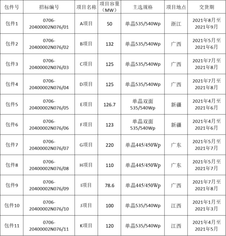根據(jù)招標公告,本次招標共分為11個標包,項目地點分布于浙江、廣西、新疆、廣東、江西五個省份,與去年不同的是,中核匯能此次集采明確了具體項目,這將給組件供貨能力以及組件報價提供更詳細的參考。