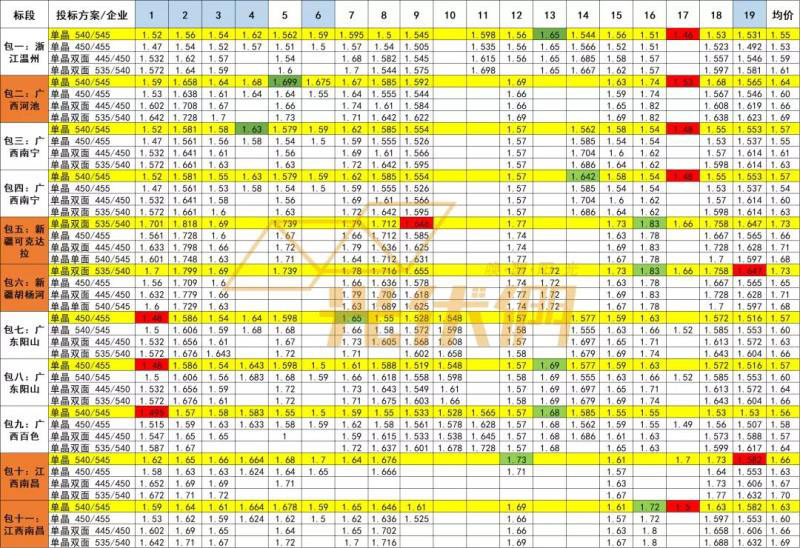總體來看,從各標段的供貨時間來看,2021年6月底之前的供貨價格要比下半年交付的價格高出7-11分/瓦。其中,最低中標價格出現(xiàn)于第一標段535/540W,該標段屬于供貨時間最晚的標段,故同時也是各標段中平均價格最低的標段,主選方案平均價格約1.55元/瓦。