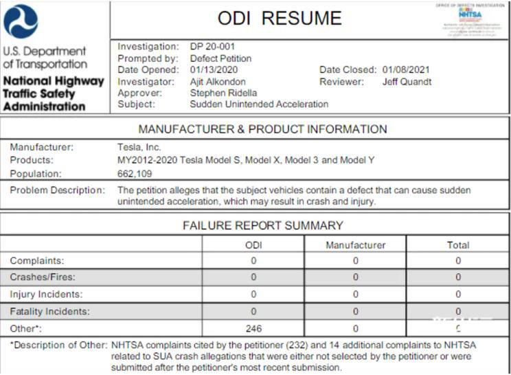 『NHTSA發(fā)布的問題調(diào)查報告』