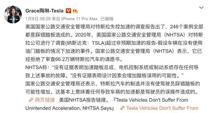中國儲能網(wǎng)訊:日前,據(jù)美國國家公路交通安全管理局(NHTSA)表示,關(guān)于特斯拉車輛的突然加速事件,“沒有找到足夠的證據(jù)證明這些車輛的油門踏板組件、電機控制系統(tǒng)或制動系統(tǒng)存在質(zhì)量問題”。對此,特斯拉對外事務(wù)副總裁陶琳也發(fā)布微博轉(zhuǎn)載了相關(guān)內(nèi)容。
