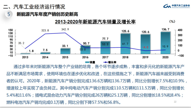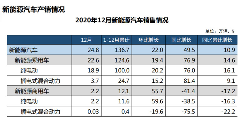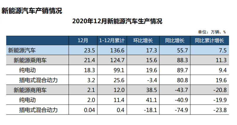 中國(guó)儲(chǔ)能網(wǎng)訊:1月13日下午,《新能源汽車(chē)報(bào)》記者從中國(guó)汽車(chē)工業(yè)協(xié)會(huì)獲悉,2020年汽車(chē)產(chǎn)銷(xiāo)形勢(shì)總體保持穩(wěn)定,產(chǎn)量環(huán)比略有下降,銷(xiāo)量小幅增長(zhǎng)。其中,新能源汽車(chē)逆勢(shì)增長(zhǎng),銷(xiāo)售136.7萬(wàn)輛,同比增長(zhǎng)10.9%,創(chuàng)歷史新高。