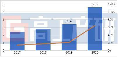 2017-2020年電動(dòng)工具市場(chǎng)鋰電池出貨量規(guī)模及預(yù)測(cè)(GWh,%)