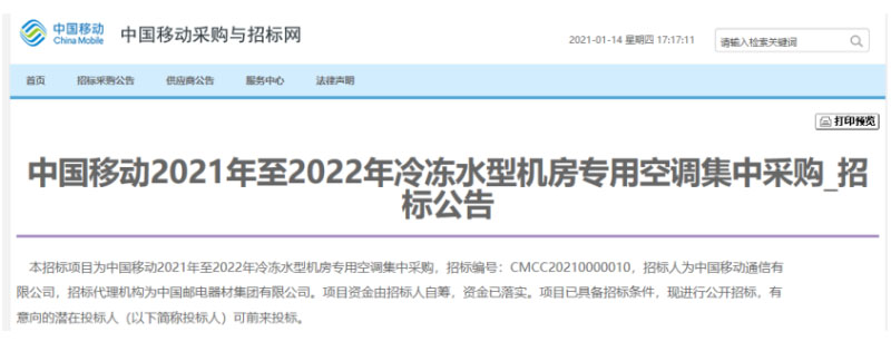 中國儲能網(wǎng)訊:日前,中國移動發(fā)布2021年至2022年冷凍水型機(jī)房專用空調(diào)集中采購招標(biāo)公告,規(guī)模為3666臺,相較2018-2019年集采規(guī)模上漲超過50%。
