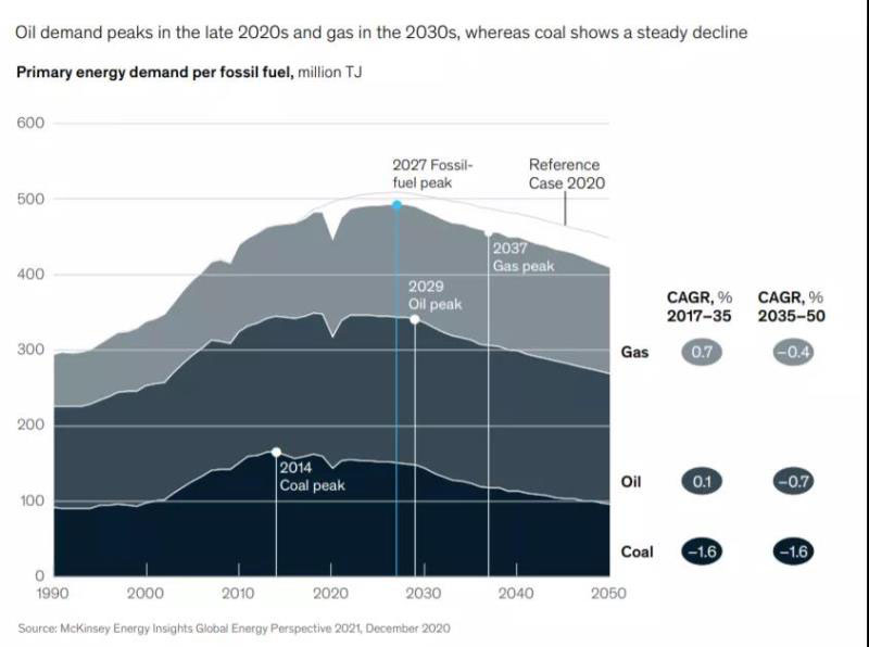 中國(guó)儲(chǔ)能網(wǎng)訊:麥肯錫公司(McKinsey Company)發(fā)布的《2021年全球能源展望》(Global Energy Perspective 2021)報(bào)告預(yù)測(cè),化石燃料總需求可能在2027年達(dá)到峰值。此前麥肯錫的報(bào)告曾預(yù)測(cè)化石燃料達(dá)峰的時(shí)間為2030年。具體而言,全球石油需求的峰值可能會(huì)在2029年到來(lái);而天然氣需求峰值將出現(xiàn)在2037年,因?yàn)楣┡ㄖ牡吞嫁D(zhuǎn)型需要的時(shí)間更長(zhǎng)。