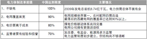 中國電力體制的市場化改革與智能電網(wǎng)互相促進(jìn)。對中國而言,電力體制的市場化改革仍然處于起步階段,目前初步實現(xiàn)了政企分離、廠網(wǎng)分離、主輔分離,在發(fā)電端引入了一定的競爭,但仍然存在很多改革難點:輸配售高度壟斷、主輔分離有所反復(fù)、電力監(jiān)管部門權(quán)責(zé)不清、電力市場尚未建立。無論從政策層面還是電力行業(yè)本身發(fā)展規(guī)律層面,我們認(rèn)為,未來的改革目標(biāo)是確定的,即發(fā)售電價格由市場競爭形成,輸配電價格由政府監(jiān)管。根據(jù)世界銀行提出的電力體制改革的四大前提,我們評估了中國目前達(dá)到的程度(如下圖所示),改革時機(jī)已經(jīng)逐步成熟。需要指出的是,歐美日等國不同的是,中國的電力市場化改革,和智能電網(wǎng)的發(fā)展,實質(zhì)上是相輔相成、互相促進(jìn)的。