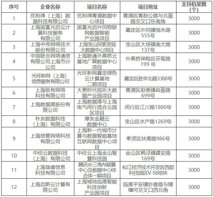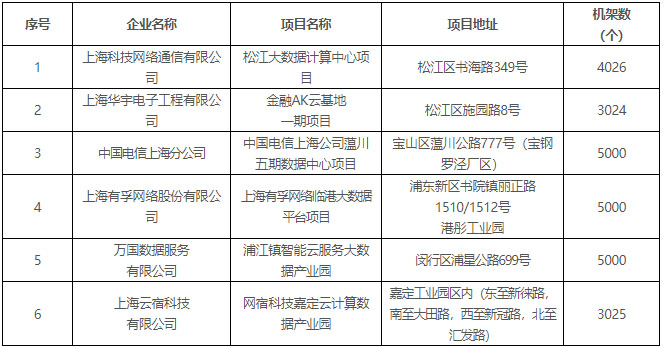 根據(jù)此前披露信息,上海當(dāng)前明確支持用能的新建互聯(lián)網(wǎng)數(shù)據(jù)中心項(xiàng)目共18個(gè),其中2019年11月獲批6個(gè),2020年6月獲批12個(gè),詳情如下: