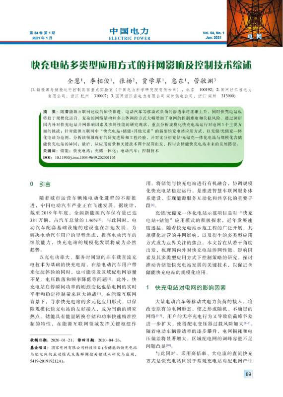 全慧, 李相俊, 張楊, 等. 快充電站多類型應用方式的并網(wǎng)影響及控制技術(shù)綜述[J]. 中國電力, 2021, 54(1): 89-95, 103.