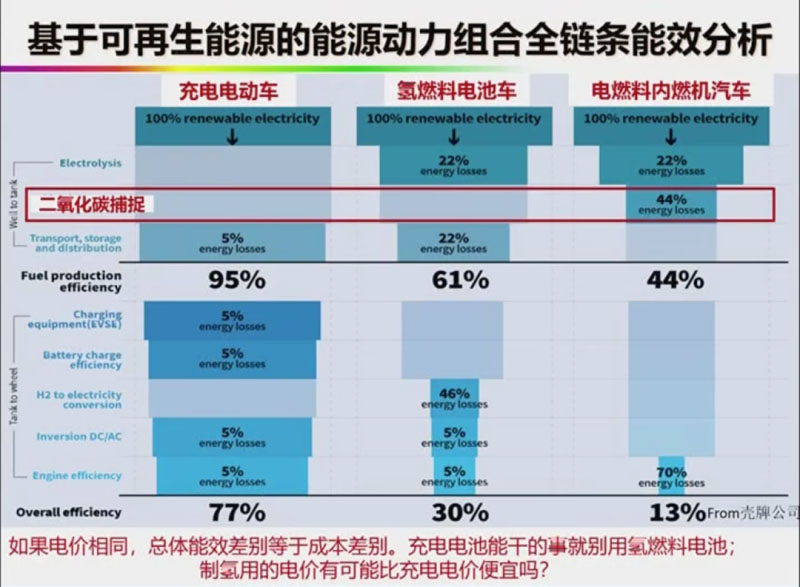 如果所有電力都來源于可再生能源,將電動汽車、氫燃料電池汽車、綠色甲醇的內(nèi)燃機汽車進行比較,全生命周期能源效率,還是電動汽車最高。