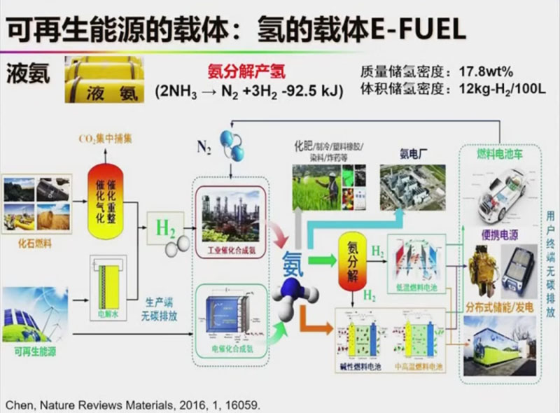 目前在很火的“液態(tài)陽光”,即“清潔甲醇”,利用光伏等可再生能源產(chǎn)生的電力電解水,制成氫,再補獲二氧化碳,生成甲醇,但捕獲二氧化碳成本很高,僅可用于飛機和遠(yuǎn)洋貨輪。