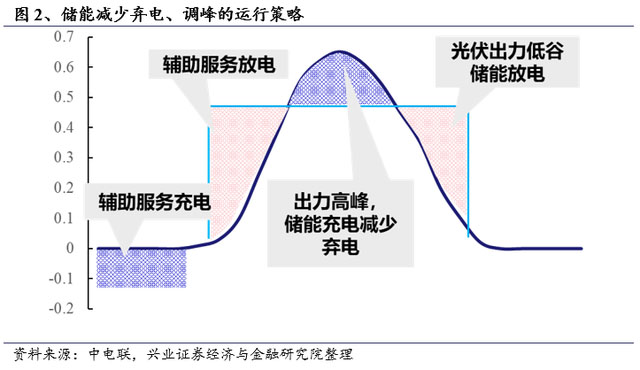 風電、光伏電站配置儲能系統(tǒng)以后,通過制定合理的充放電策略可以有效避免棄電。以光伏為例,在正午時分,光伏出力往往會超過負荷曲線,在沒有儲能的情況下,此時只能棄電。而配置儲能后則可以在此期間給儲能系統(tǒng)充電,避免了棄電損失。在光伏出力低谷時期,則可將儲能設備中的電能放出,并參與提供調(diào)峰、調(diào)頻等電力輔助服務,獲取響應收益。
