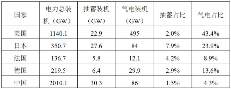 表1 2019年各國(guó)抽水蓄能及氣電裝機(jī)情況
