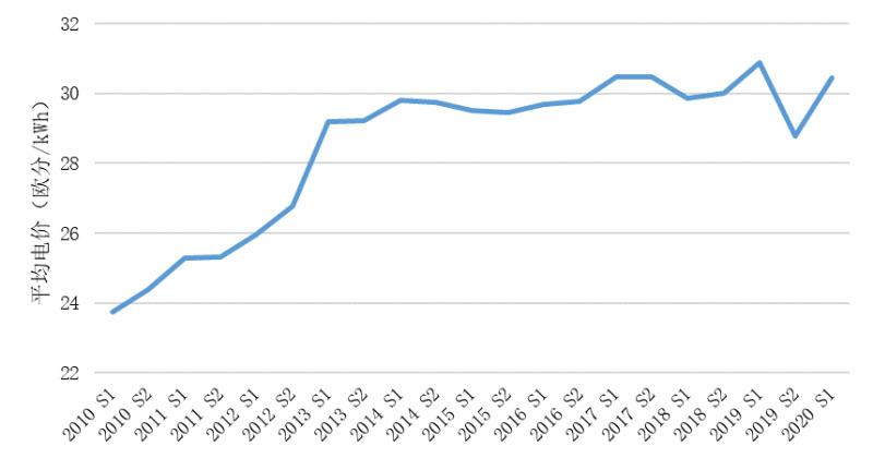 圖4 2010年上半年(2010 S1)~2020年上半年(2020 S1)德國(guó)平均電價(jià)變化趨勢(shì)(數(shù)據(jù)來(lái)源:statista)