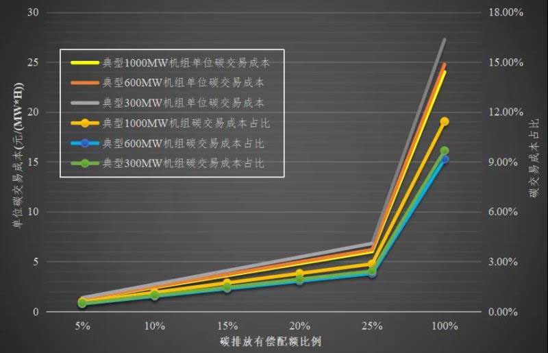 基于前述規(guī)則,筆者以目前參與廣東碳市場的典型火電燃煤機(jī)組(裝機(jī)容量分別為300MW、600MW和1000MW)作為研究對象,測算在不同碳價(jià)格和不同有償配額比例情況下,電廠購買碳配額的單位交易成本以及占發(fā)電機(jī)組變動(dòng)(燃料)成本的比重。
