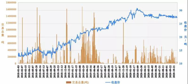 圖2 廣東碳交易二級市場交易總量及收盤價(jià)趨勢圖