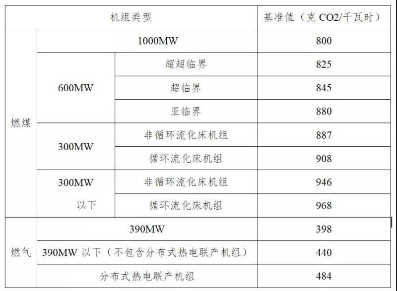 電力行業(yè)燃煤燃?xì)獍l(fā)電機(jī)組(含熱電聯(lián)產(chǎn)機(jī)組)使用基準(zhǔn)線法分配配額,對單位產(chǎn)品的二氧化碳排放量設(shè)置標(biāo)準(zhǔn)。計(jì)算公式為:控排企業(yè)碳排放配額=產(chǎn)量×基準(zhǔn)值(見表1);新建項(xiàng)目企業(yè)碳排放配額=設(shè)計(jì)產(chǎn)能×基準(zhǔn)值(見表1)。特殊燃料發(fā)電機(jī)組(如煤矸石、油頁巖、水煤漿、石油焦等燃料)以及供熱鍋爐采用歷史強(qiáng)度下降法分配配額,即要求排放單位年度碳排放強(qiáng)度與自身的歷史碳排放強(qiáng)度相比有所下降。
