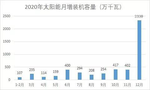 根據(jù)國家能源局?jǐn)?shù)據(jù),2020年1-11月新增風(fēng)電裝機(jī)2462萬千瓦,新增太陽能發(fā)電裝機(jī)2590萬千瓦。這意味著,僅2020年12月的風(fēng)電、太陽能的新增裝機(jī)容量分別高達(dá)4705萬千瓦、2330萬千瓦。
