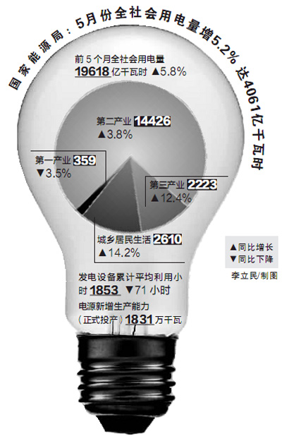 6月13日召開的2012年全國電力迎峰度夏新聞發(fā)布會公布數(shù)據(jù)顯示,今年前5個月,全社會用電量為1.96萬億千瓦時,同比增長5.8%,增幅回落6.2%;5月份,全社會用電量4061億千瓦時,同比增長5.2%,增幅回落5.6%。兩者均為近幾年較低水平。
