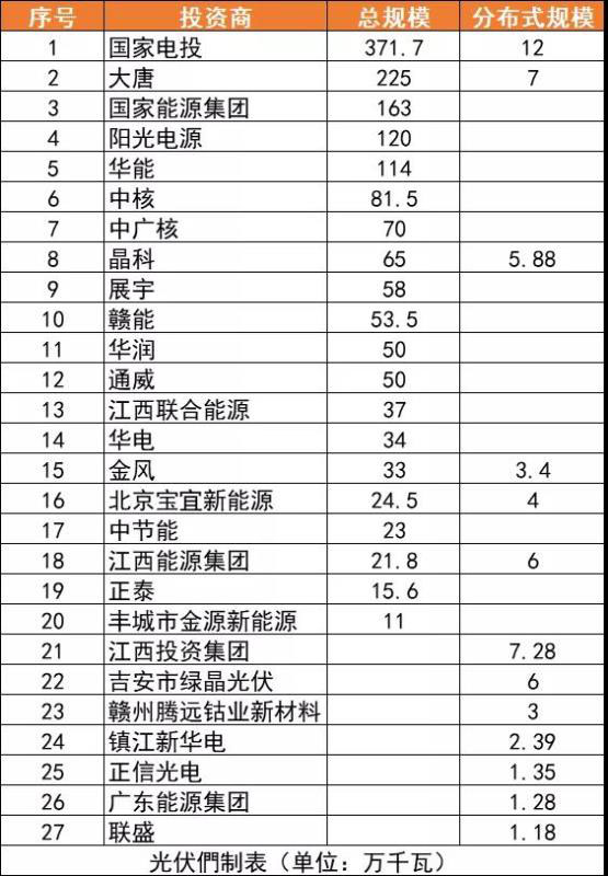 光伏們根據(jù)對594個入庫光伏項目經(jīng)過梳理后發(fā)現(xiàn),開發(fā)規(guī)模TOP5的企業(yè),其入庫項目均超1GW,以國家電投、大唐、中核、華能、中廣核等為代表的央企仍是光伏電站開發(fā)的主力軍,而民營企業(yè)則由陽光電源、晶科領(lǐng)銜。除上述典型代表企業(yè)外,江西省能源集團以及贛能股份等省屬地方投資企業(yè)也斬獲了約800MW的光伏項目。具體情況見下表格: