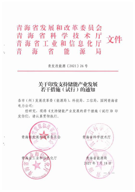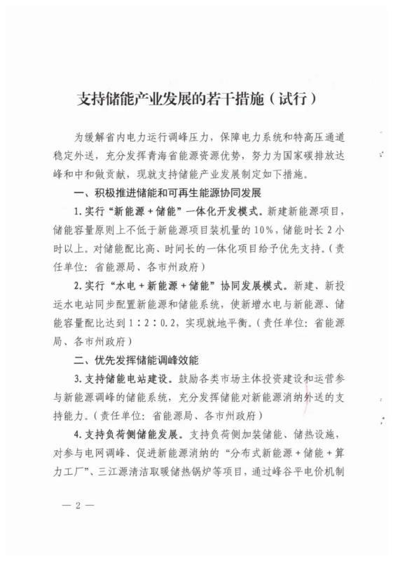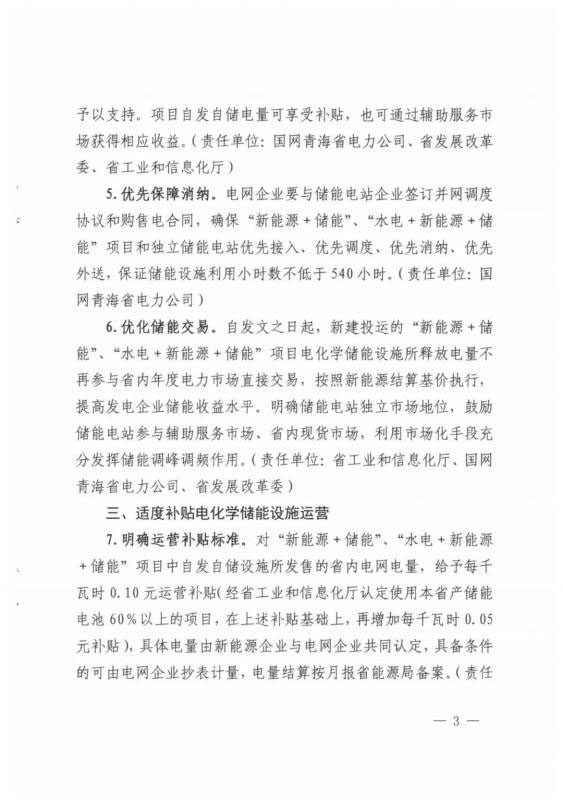 中國(guó)儲(chǔ)能網(wǎng)訊:1月18日,青海省發(fā)改委、科技廳、工信廳、能源局聯(lián)合下發(fā)《關(guān)于印發(fā)支持儲(chǔ)能產(chǎn)業(yè)發(fā)展若干措施(試行)的通知》,對(duì)"新能源+儲(chǔ)能” 、"水電+新能源 + 儲(chǔ)能”項(xiàng)目中自發(fā)自儲(chǔ)設(shè)施所發(fā)售的省內(nèi)電網(wǎng)電量,給予每千瓦時(shí)0.10元運(yùn)營(yíng)補(bǔ)貼,如果經(jīng)省工業(yè)和信息化廳認(rèn)定使用本省產(chǎn)儲(chǔ)能電池60%以上的項(xiàng)目,在上述補(bǔ)貼基礎(chǔ)上,再增加每千瓦時(shí)0.05元補(bǔ)貼。